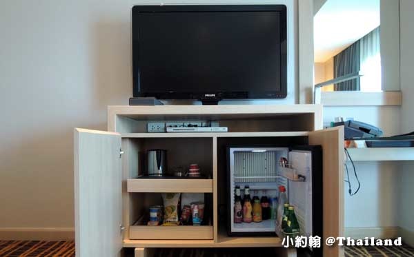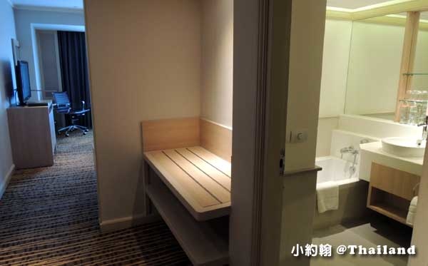 打開房門插上磁卡,右手邊是浴室、行李檯,左手邊是衣櫃、小冰箱、收納櫃。