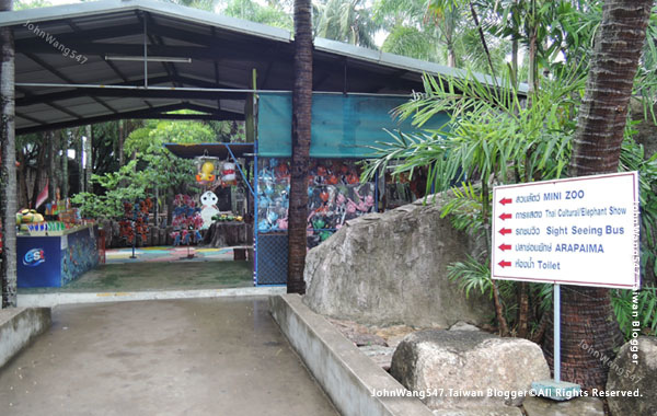停好機車後,一旁不遠入口就是Mini Zoo迷你動物園區,指標上還有Thai Cultural Show/Elephant Show泰國文化秀/大象秀、Sight Seeing Bus園內觀光巴士、Arapaima巨骨舌魚。往這個方向,就能進入東芭樂園的精華區。