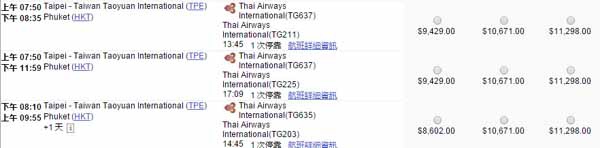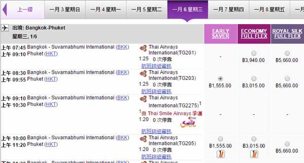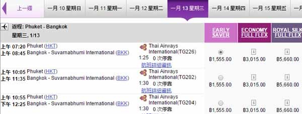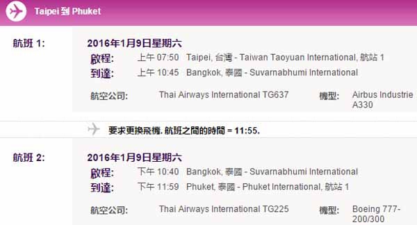泰國航空Thai Airways 飛往普吉島Phuket機票比較貴,在曼谷機場轉機時間,從2個半小時到12小時都有呢!
