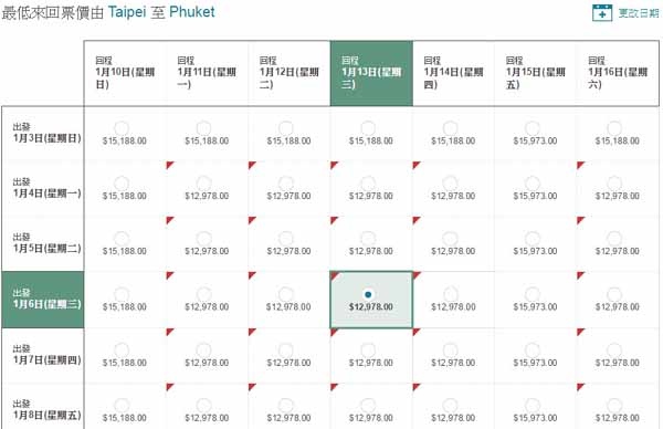 上圖:國泰航空飛往普吉島Phuket機票,來回價格近1萬3千元含稅,官網訂票的好處是,提早取消也只扣1千多元。