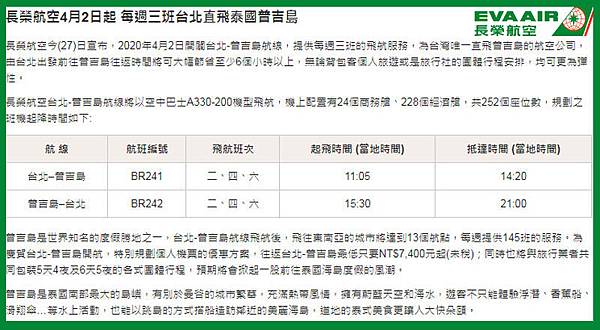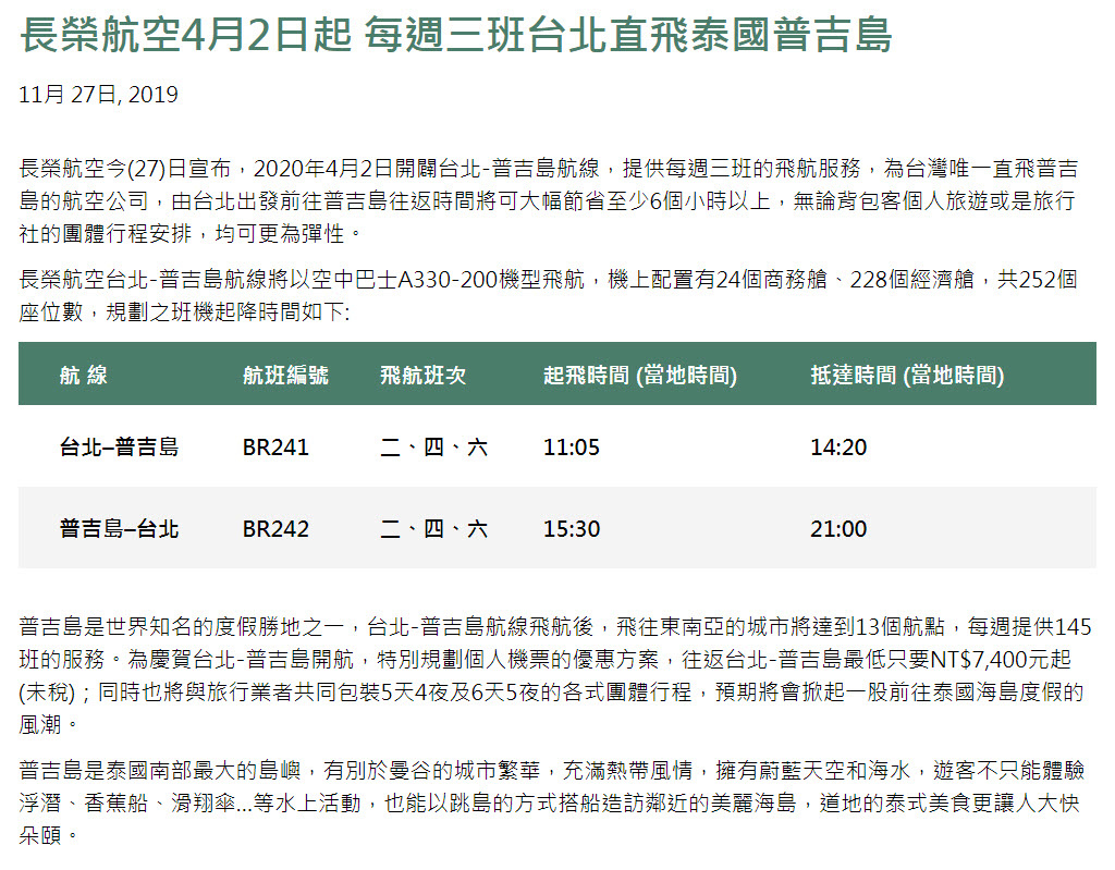 2019年11月27日長榮航空官網公告:2020年4月2日起 每週三班台北直飛泰國普吉島
