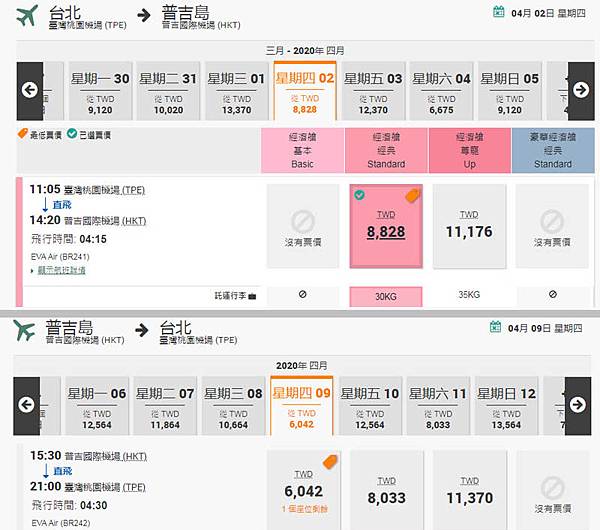 2020年1月中查看長榮航空TPE-HKT直飛泰國普吉島來回機票要1萬2起~