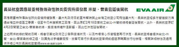 上圖:2020年2月6日長榮航空官網公告:長榮航空因武漢肺炎疫情,飛往義大利米蘭、泰國普吉島的航班延後開航。