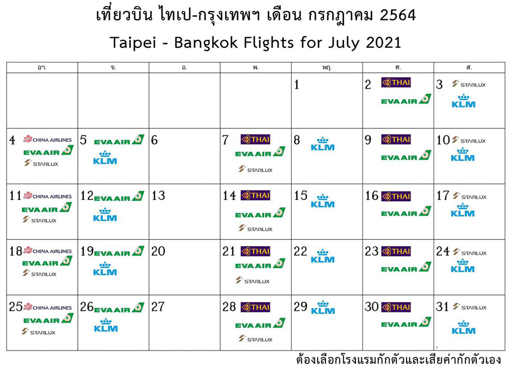 上圖:泰國貿易經濟辦事處在臉書分享2021年7月飛往泰國曼谷的航空公司。