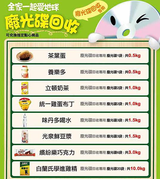 一般的廢棄CD、VCD、DVD等光碟片,但不包含塑膠唱片。 | 將廢棄的光碟片交由門市人員秤重回收,以每滿0.5公斤為單位,提供購物優惠折抵5元(不包含代收、代售、香菸等商品),限當次消費抵用。 | 例如拿0.5公斤到門市回收,當次購物可折抵金額為5元,1公斤可折抵10元,1.5公斤可折抵15元,以此類推。 |