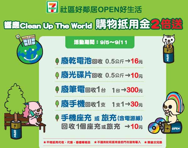 各廠牌的手機座充或旅充,必須含電源線完好才可回收。 | 將廢棄的手機座充或旅充交由門市人員回收,每組提供購物優惠折抵3元(不包含代收、代售、香菸等商品),限當次消費抵用。 | 每組座充或旅充可折抵3元購物抵用金,2組可折抵6元,3組可折抵9元,以此類推 |