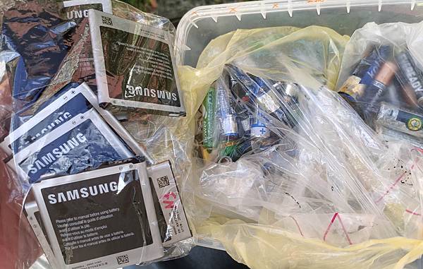 2025年6月在某家資源回收站,把家裡放了多年漲起來的手機鋰電池、電視搖控器電器使用3號4號乾電池整理起來,有些已經漏液,幾顆還變形了。回收站說,都可以收。