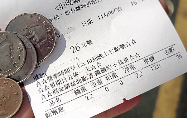 廢電池重2.2公斤,回收電池換得26元。每公斤12元。