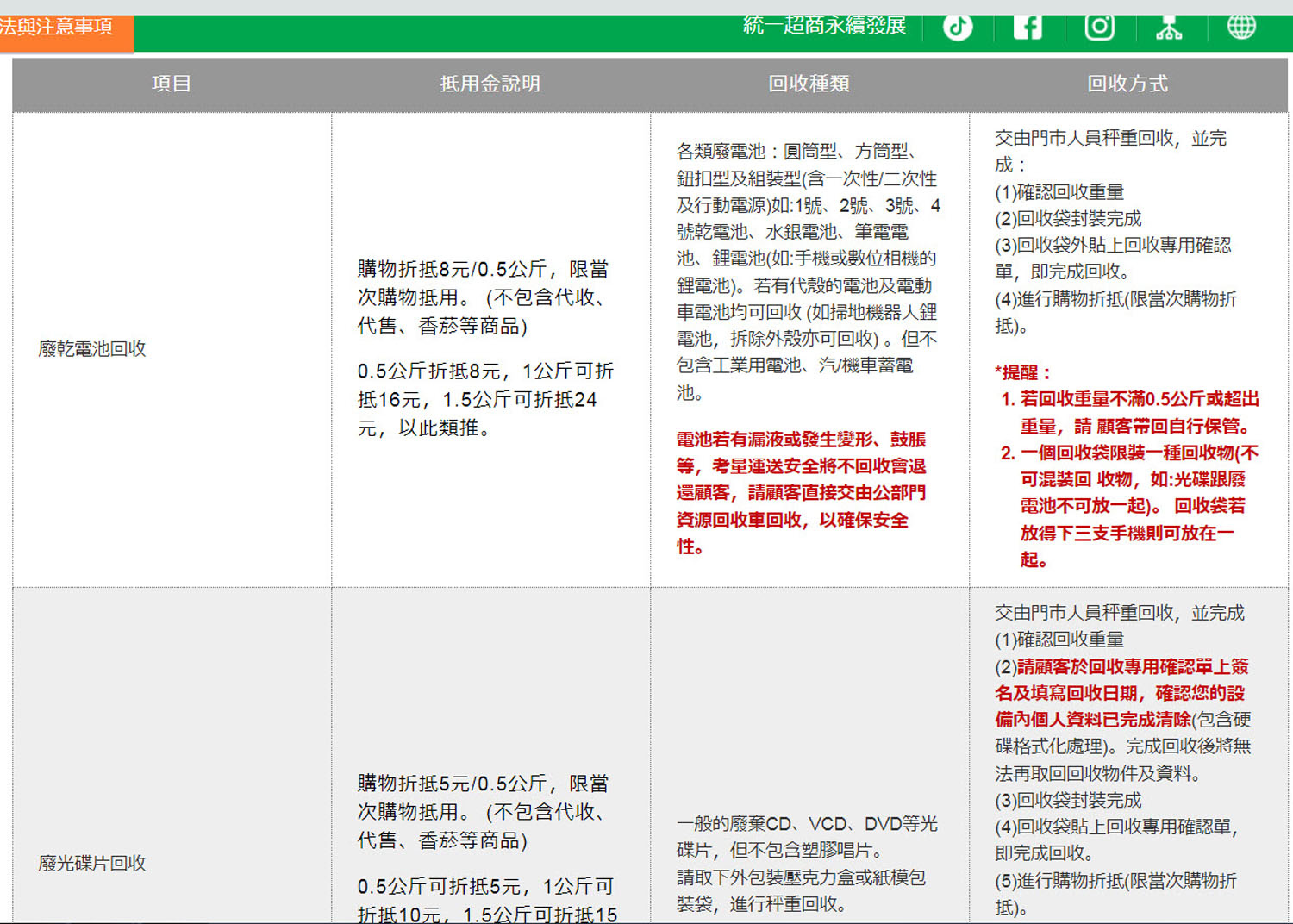 廢乾電池回收:1號、2號、3號、4號乾電池、水銀電池、鋰電池(指手機或數位相機的鋰電池)均可回收,但不包含工業用電池、汽/機車蓄電池、筆電電池。 | 將廢乾電池交由門市人員秤重回收,以每滿0.5公斤為單位,提供購物優惠折抵8元(不包含代收、代售、香菸等商品),限當次消費抵用。 | 例如拿0.5公斤到門市回收,當次購物可折抵金額為8元,1公斤可折抵16元,1.5公斤可折抵24元,以此類推。 |
