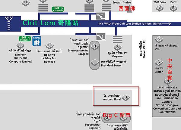 2.機場快線到終點站轉換BTS捷運到Chit lom奇隆站+步行5分鐘。