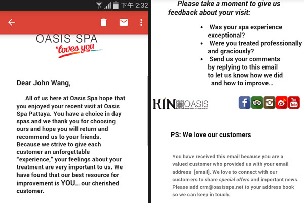 泰貼心,再一次詢問是否對服務滿意。所以顧客有兩次回覆意見的機會,也看得出Oasis Spa Loves me!服務流程真的泰有心!