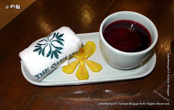 Oasis Spa Pattaya櫃台迎接我們到沙發區,然後有人奉上冰毛巾與茶水。