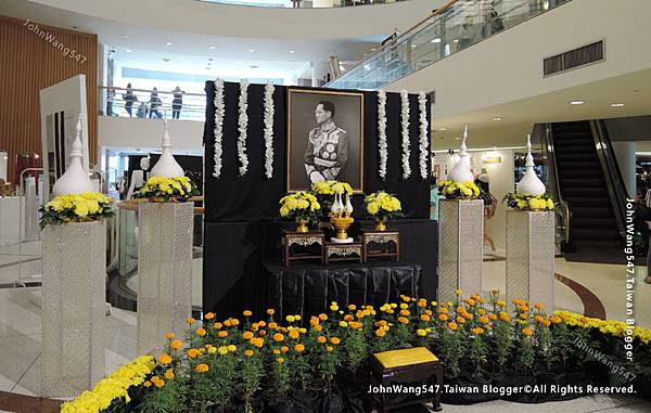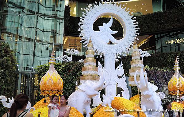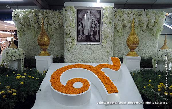 曼谷市中心Siam Paragon暹羅百麗宮百貨在室內一樓生態廣場,做了大型紀念泰皇的造景,以白象與黃花組成,成了民眾拍照打卡熱點。