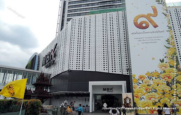 曼谷MBK百貨商場門外掛上大大泰皇符號與黃花海報。相關文章:MBK Center購物商場+TOKYU 東急百貨@National Stadium