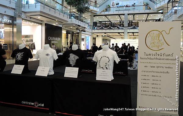 Central World百貨還舉辦了另一個有意思的活動,我觀察了一下,應該是民眾自行帶黑色、白色或深色素面衣服,選擇展示架上泰皇紀念圖案,現場幫你印圖案上去喔!泰有意思了!