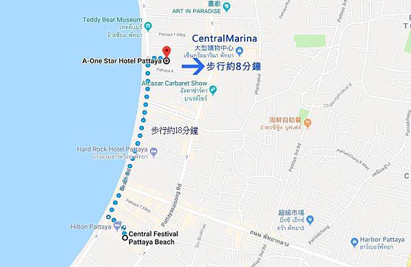 從A-One Star Hotel走到Central Marina百貨大約8分鐘。相關文章:芭達雅CentralPlaza Marina Pattaya百貨與BIG C超市~