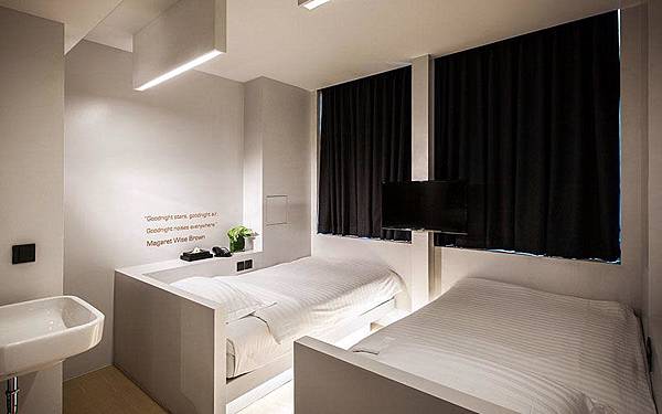 這真的是很經濟空間的設計,好處是當有人在廁所,另一個人還能刷牙,但壞處也是,當有一個人睡,另一個洗手就可能吵到對方。