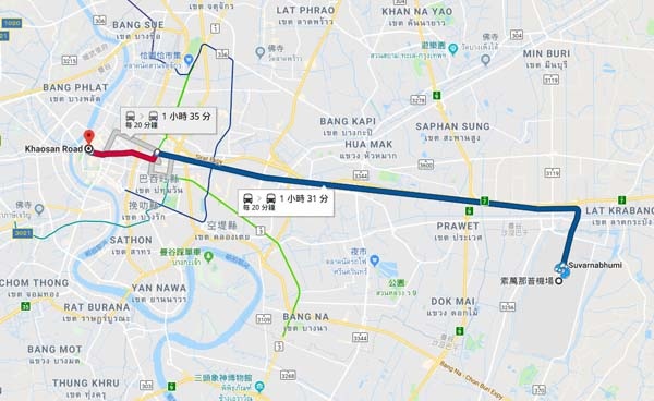 曼谷Suvarnabhumi Airport機場到考山路的車程,不塞車約1個半小時。看過網友分享曼谷BKK機場到考山路計程車資大約在320泰銖左右。
