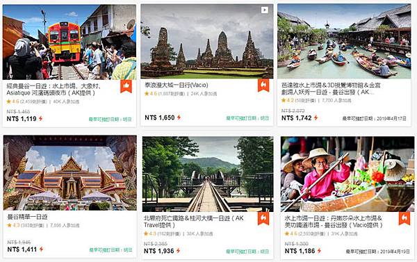 曼谷一日遊的選擇不少,長年熱門的是「泰國水上市場一日遊」、「大城古蹟一日遊」,另外也有昭披耶河、芭達雅、桂河一日遊,見上圖可得知道曼谷一日遊的價格,大多落在1200~2000之間,視行程豐富度而定。