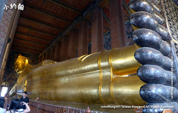 進入臥佛寺(Wat Pho)後,導遊先去幫大家買票,大家脫鞋進入主寺,欣賞巨大金光臥佛,繞一圈拍照。導遊則先去幫大家換冰涼礦泉水。