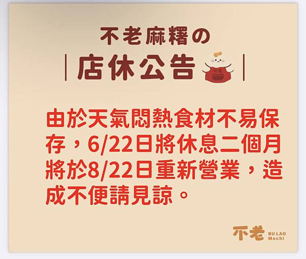 不老客家傳統麻糬在2021年5月中時已經公告,受到疫情影響暫停營業了!到2022年8月臉書仍沒更新,預計9月3日會重新營業。
