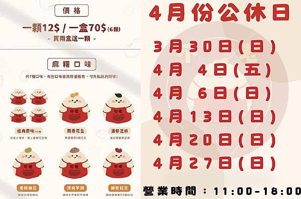 不老麻糬2025年維持一顆12元,6顆一盒70元,買兩盒送一顆。一般休星期日,2025年4月公休日見上圖右,清明節休假。