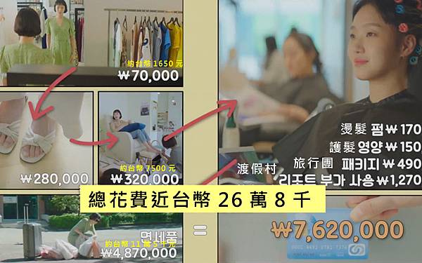 劇情中團費490萬韓元(約1萬2元台幣),升級渡假村住宿約3萬台幣。柔美的旅行戰利品花了487萬韓元(約台幣11萬5千元),總花費約台幣26萬8千。所以女主角的會計代理工作,月薪有台幣8萬多元。