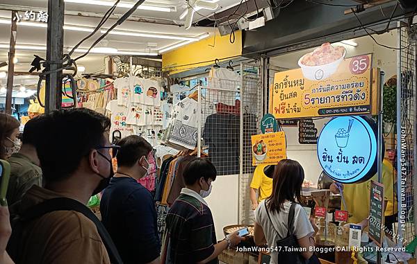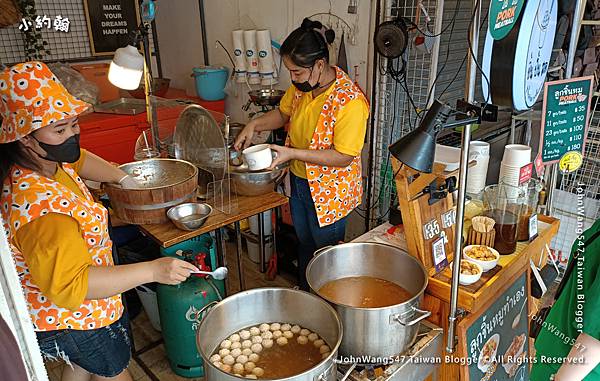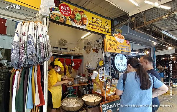 除了買衣服飾品香精伴手禮,市集裡也有許多泰式美食小吃,來分享一間去年就注意到的排隊小吃「豬肉丸」Pork Meatballs。