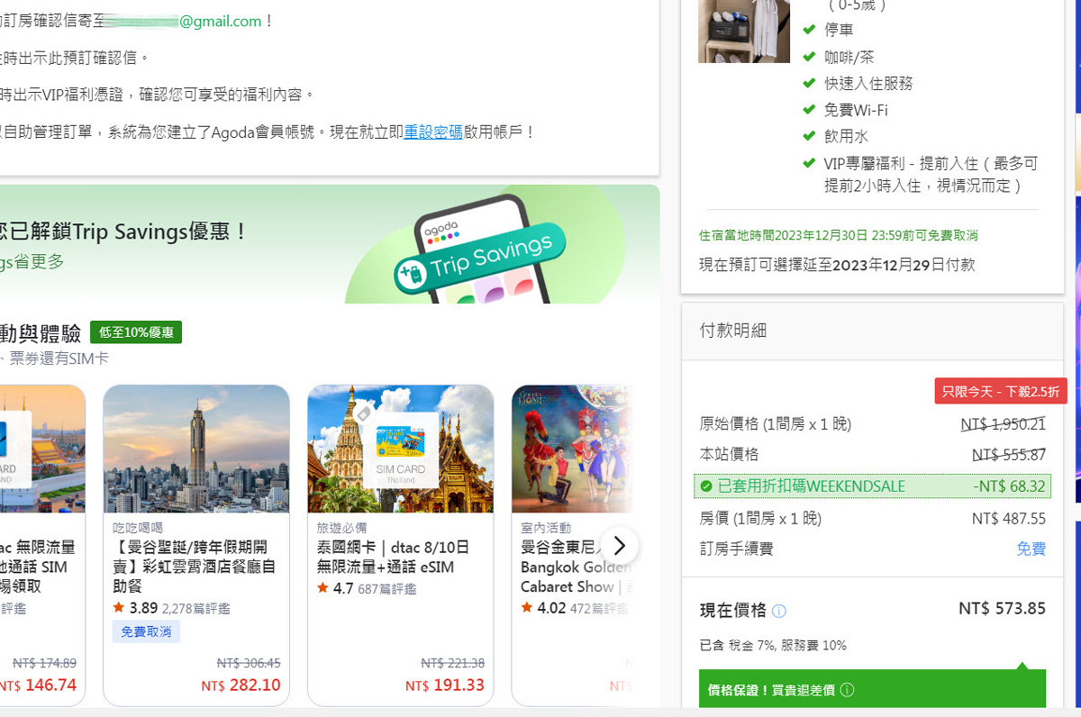 訂單確認!付款了,安心了,我的曼谷跨年夜房間ok!