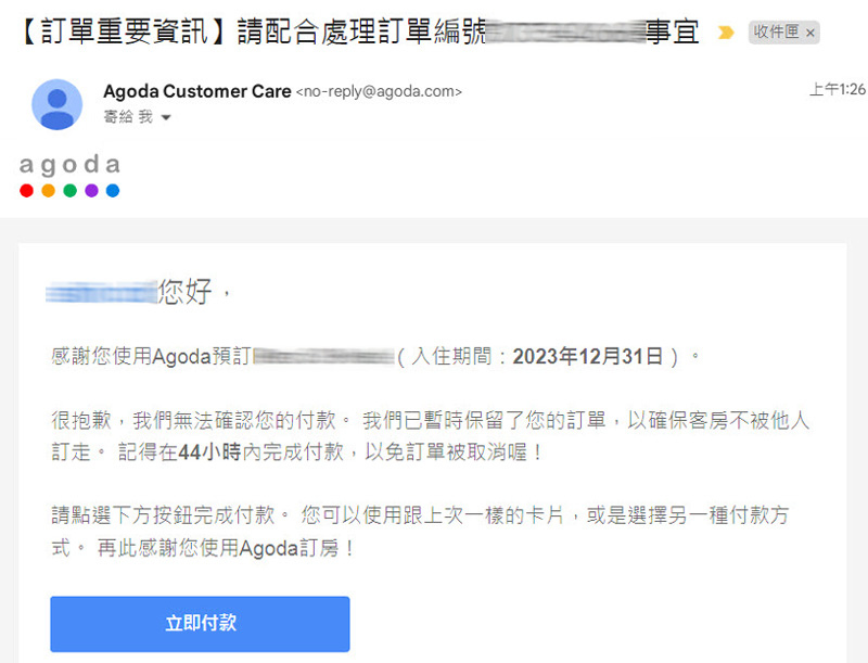 由於當初訂房選「延後付款」,在12月29日收到agoda來信,【訂單重要資訊】請配合處理訂單編號...事宜: