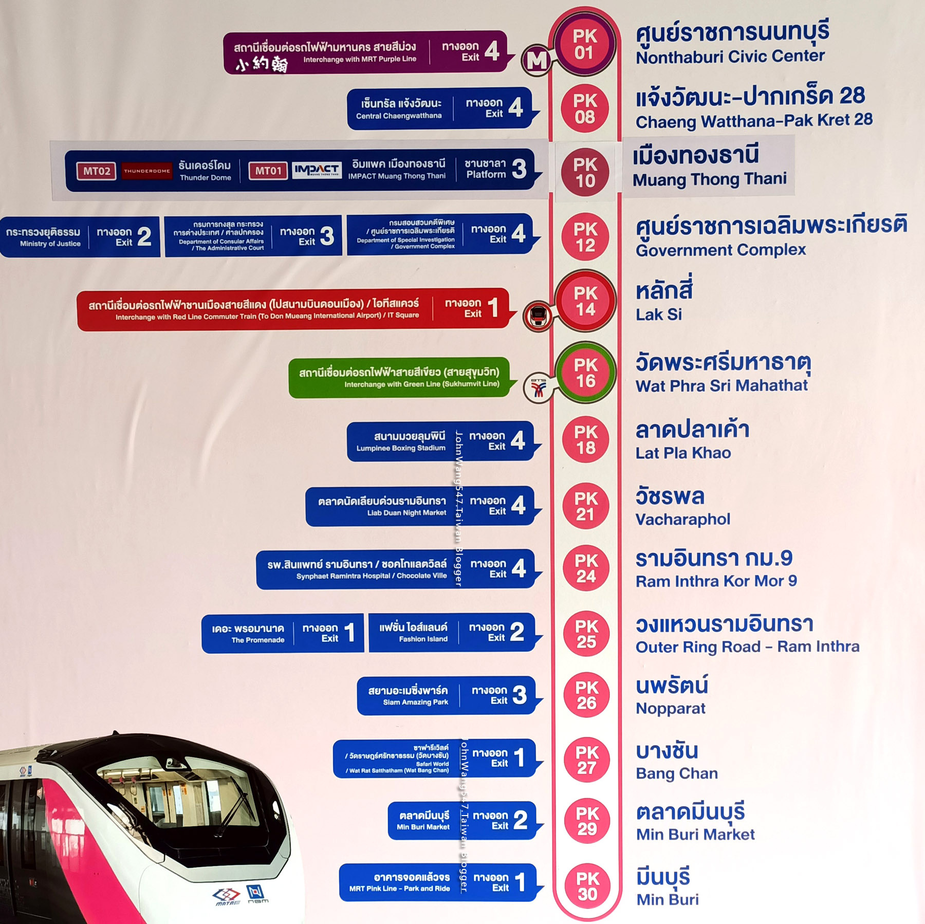 上圖:曼谷MRT官方粉紅線空鐵泰文英文版路線圖,車站編號由PK01~PK30,30個站,點圖可放大查看。