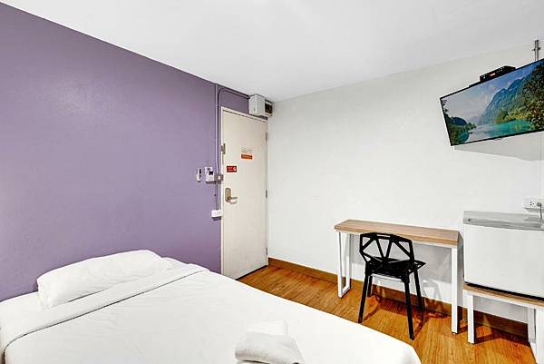 單人房附衛浴的房型有電視小冰箱,簡單的桌椅。照片都是廣角拉寬了,單人房只有15平方公尺大。