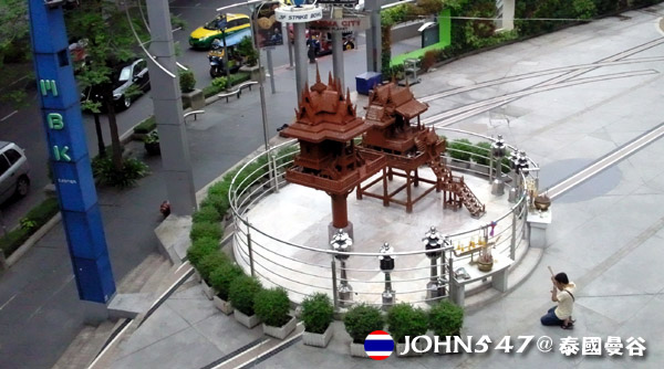 MBK一樓外的廣場上有特殊柚木色宗教迷你建築,偶爾會看到泰國人來上香!