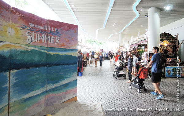 MBK Center在一樓戶外區打造「Hello Summer」市集,有泰國小吃、水果、服飾攤販,有遮蔽的屋簷下輕鬆逛逛。