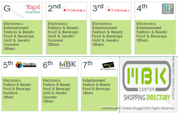MBK一樓有服飾、特賣會、速食店和TOPS超市...二樓以皮件、成衣、藥妝...三樓金飾、珠寶、成衣...四樓3C商品、銀行...五樓家具、美容、SPA...六樓美食街、餐廳...七樓是電影院、保齡球館、卡拉OK與速食店...