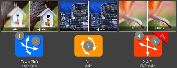 EIS是利用偵測到機身抖動的程度來動態調整ISO、快門或軟體來做模糊修正。透過影像裁減補償方式來避免模糊,必須犧牲影像的解析度與大小,效果較不優。