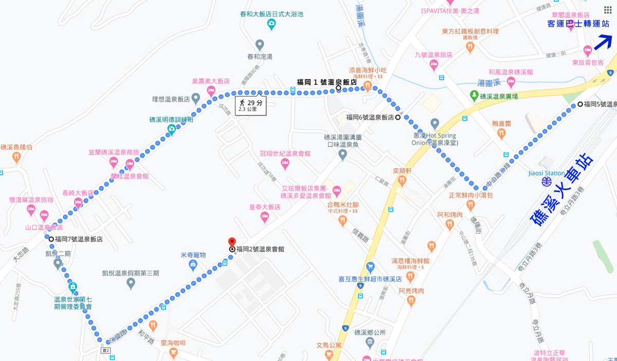 透過上圖礁溪地圖,由右至左步行30分鐘內/車程10分鐘內),分別是福岡5號溫泉會館、福岡6號溫泉飯店、福岡1號溫泉飯店、福岡2號溫泉會館、福岡7號溫泉飯店。